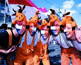 人們穿著橙色的衣服,帶著橙色的帽子,姑娘們圍著橙色的圍巾,甚至把眼睫毛也涂成橙色。孩子們用橙色涂料把臉蛋、手臂涂成各種花紋圖案。橙色的郁金香遍地怒放,任何橙色的或與王室有關(guān)的產(chǎn)品都成為了搶手貨。荷蘭王室籃子奧蘭治(Orange)家族,Orange在英文中是橙色的意思,所以橙色成為荷蘭的國(guó)色,女王日就成了“橙色的女王日”。